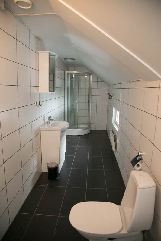 Rakt fram till höger på övervåningen ligger badrummet som har byggts om och renoverats. För att få större utrymme har man byggt in en del som tidigare hörde till hallen. Det är ett långsmalt rum med duschkabin längst in. Direkt till höger finns tvättmaskin och rakt fram WC. På vänster sida finns tvättställ med kommod och spegelskåp. Ett mindre fönster. Rummet har klinker på golvet, kakel på väggen och vitmålat tak.