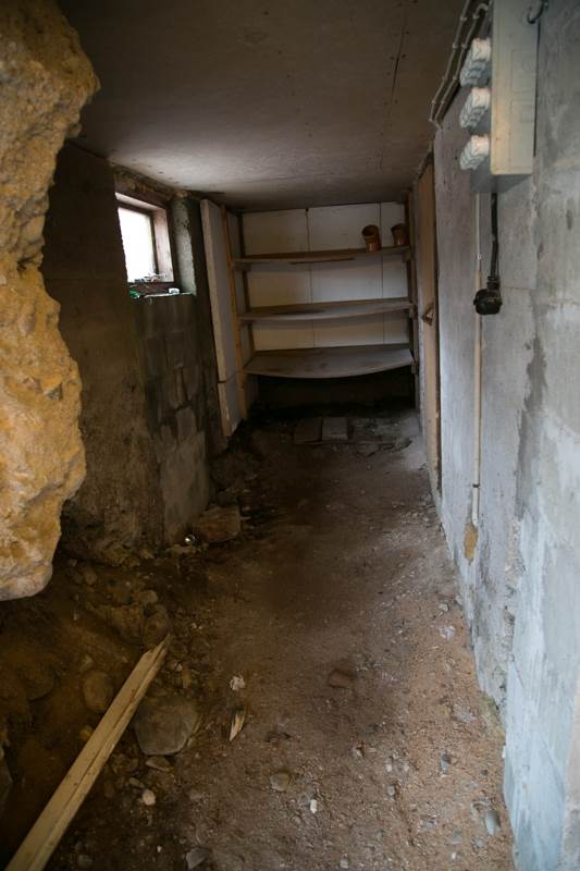 Under trappen finns ett praktiskt förrådsutrymme. Här finns en hylla med krokar och utrymme för en byrå eller ett hyllsystem. Trägolv och spånskivor på väggarna.