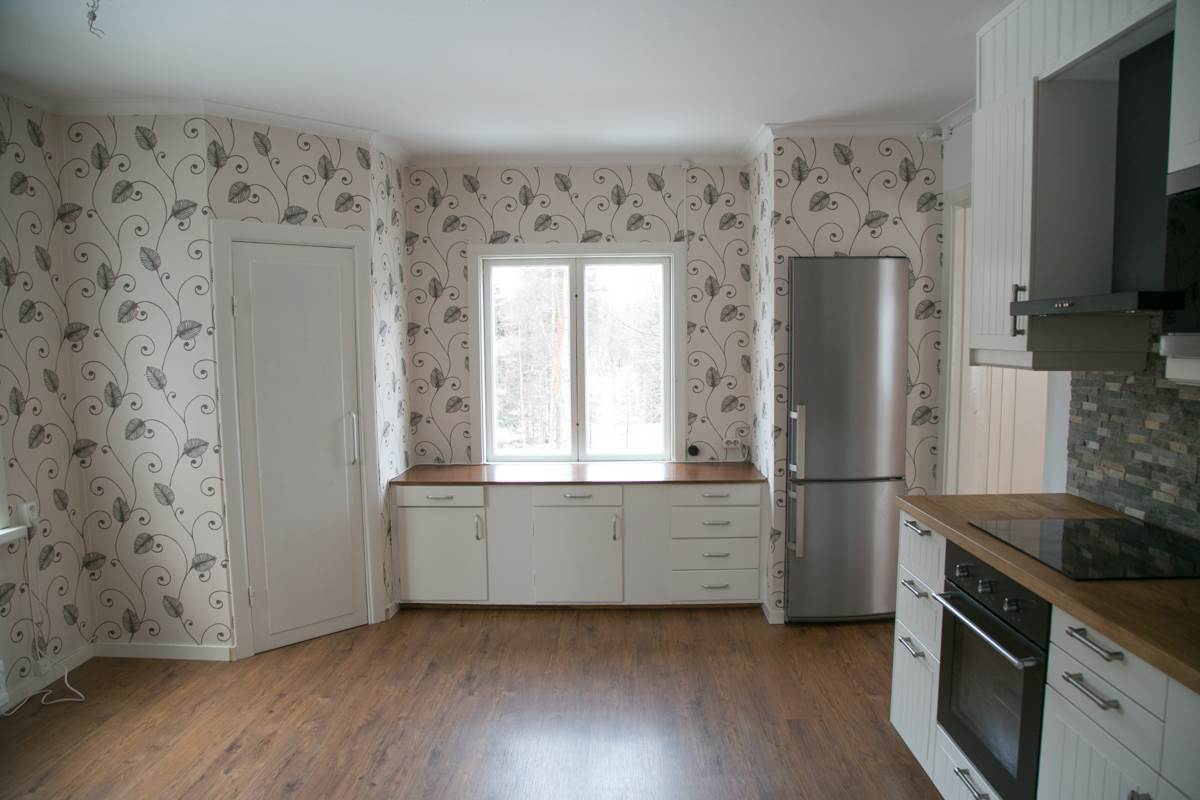 Rakt fram i hallen ligger det nyrenoverade köket. Ett rymligt rum med en trevlig arbetsbänk vid ena fönstret samt inbyggd kyl/frys. På höger sida finns köksdelen som har renoverats med nya skåp från Ikea, bänkskiva i massiv ek och nedfälld diskho i rostfritt. På väggen sitter en robust natursten som ger en snygg detalj mot de moderna vitvarorna i rostfritt. Köket har nya vitvaror i form av spis med induktionshäll, fläktkåpa i svart samt inbyggd mikro. Till vänster om arbetsbänken finns ett skafferi med hyllor. Bredvid skafferiet finns ett fönster och framför det finns rum för en trevlig matplats. Laminatgolv, mönstrad tapet på väggar, samt vitmålat tak.
