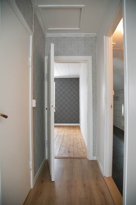 I hallen finns en trapp som leder upp till övervåningen. Trapphuset är vitmålat och ljust med ett fönster på övervåningen. Trapphuset med halldel har en fin gråmönstrad tapet och vitmålad panel. Parkett på golvet och vitmålat tak.