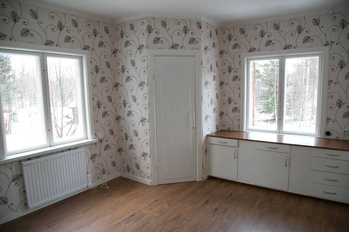 Till höger i hallen kommer man till vardagsrummet. Ett ljust och trevligt rum med stora hörnfönster som släpper in härligt ljus. Vardagsrummet bestod från början av två rum, ett vardagsrum och ett sovrum. Nu har man tagit bort väggen och fått ett stort och härligt rum med gott om utrymme för sittmöbel, bokhyllor och läshörna. Skulle en ny ägare ha behov av ett extra sovrum är det enkelt att sätta upp en ny vägg igen. I mitten av rummet finns en liten spiskamin och på väggen sitter en luft-luft värmepump som sprider behaglig värme. Laminatgolv, tapet/målade väggar samt vitmålat tak.